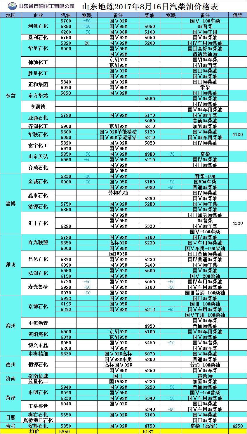 山東地?zé)?017年8月16日汽柴油價(jià)格表