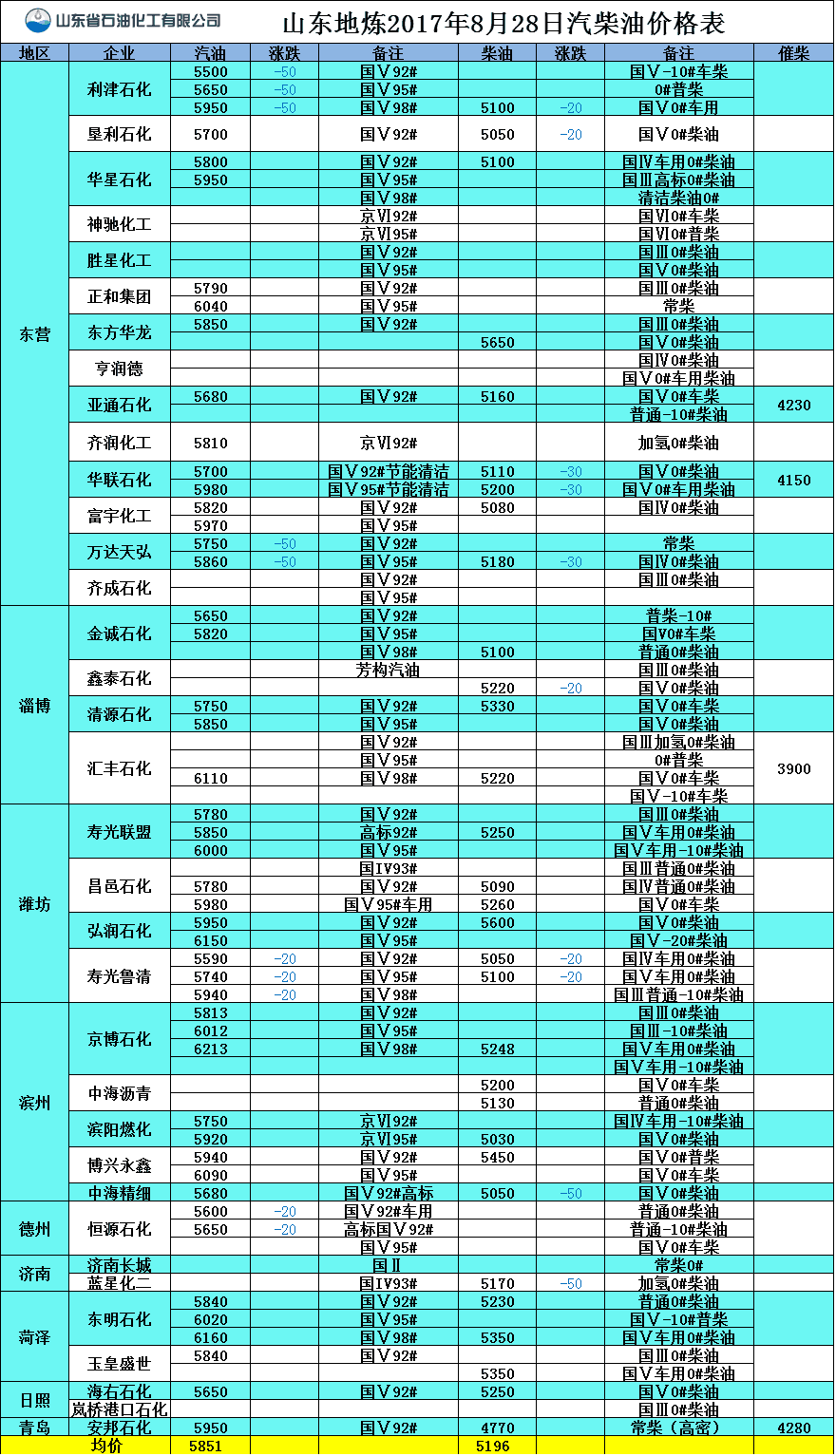山東地?zé)?017年8月28日汽柴油價(jià)格表
