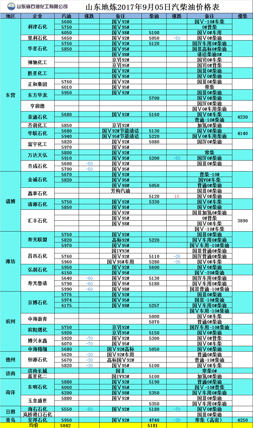 山東地煉2017年9月05日汽柴油價格表