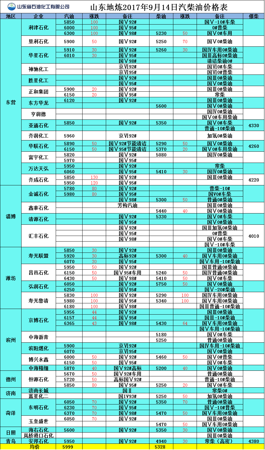 山東地?zé)?017年9月13日汽柴油價格表