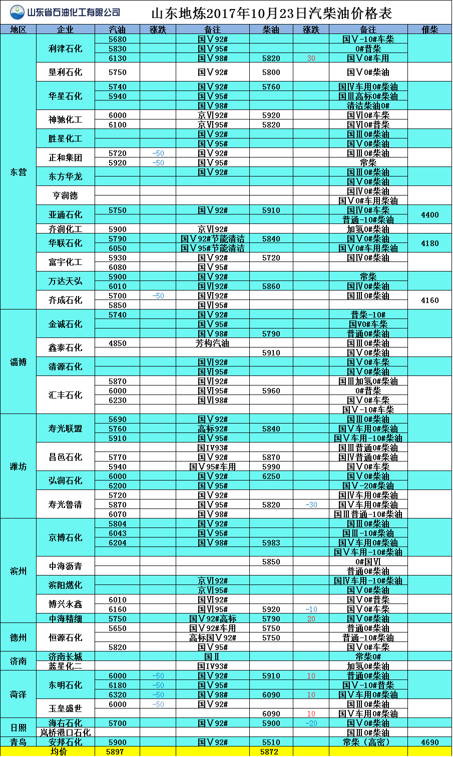 山東地?zé)?017年10月23日汽柴油價(jià)格表