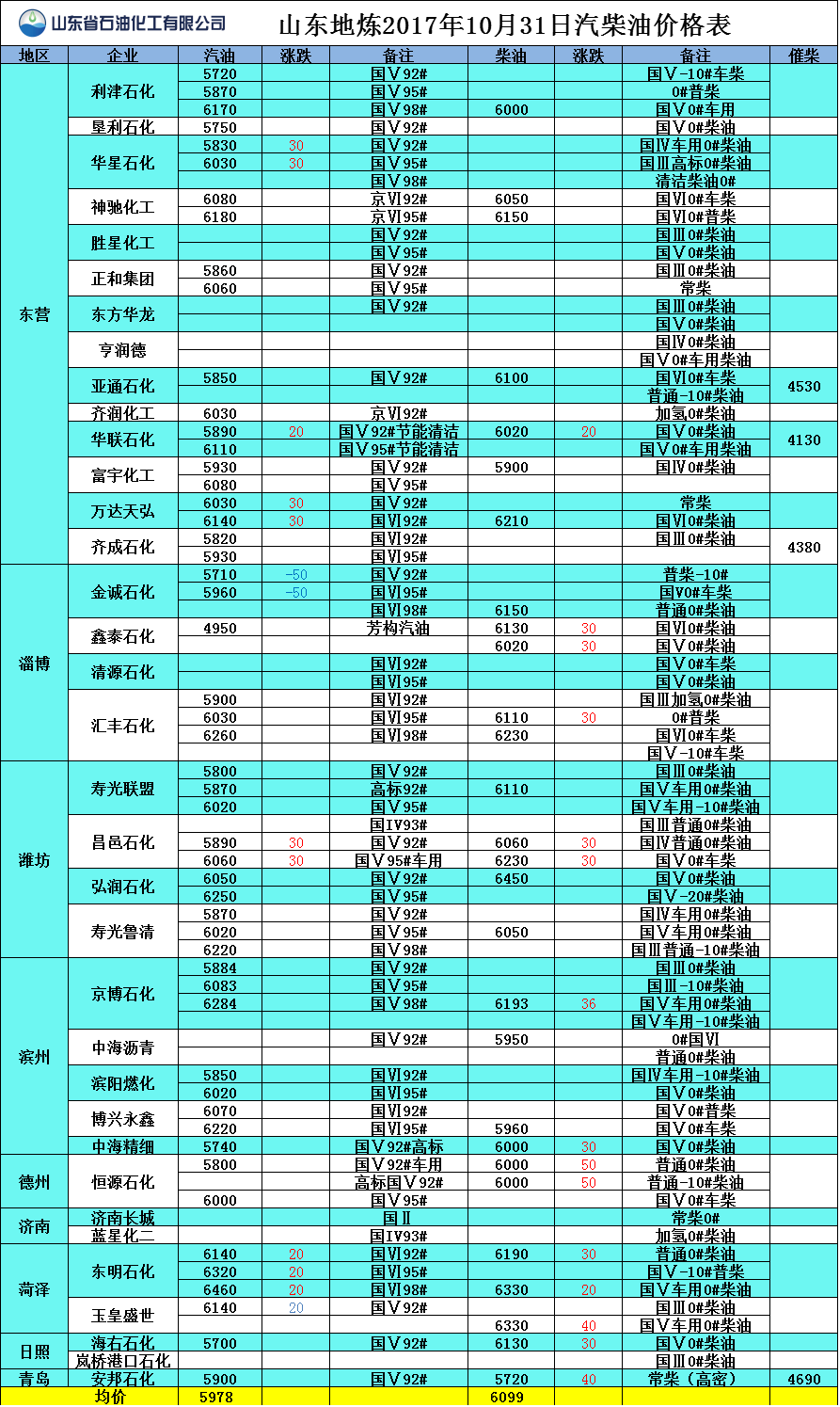 山東地煉2017年10月31日汽柴油價格表