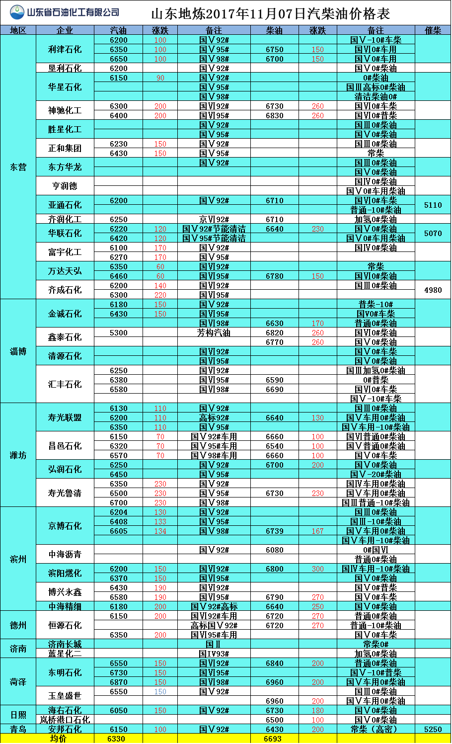 山東地?zé)?017年11月6日汽柴油價(jià)格表