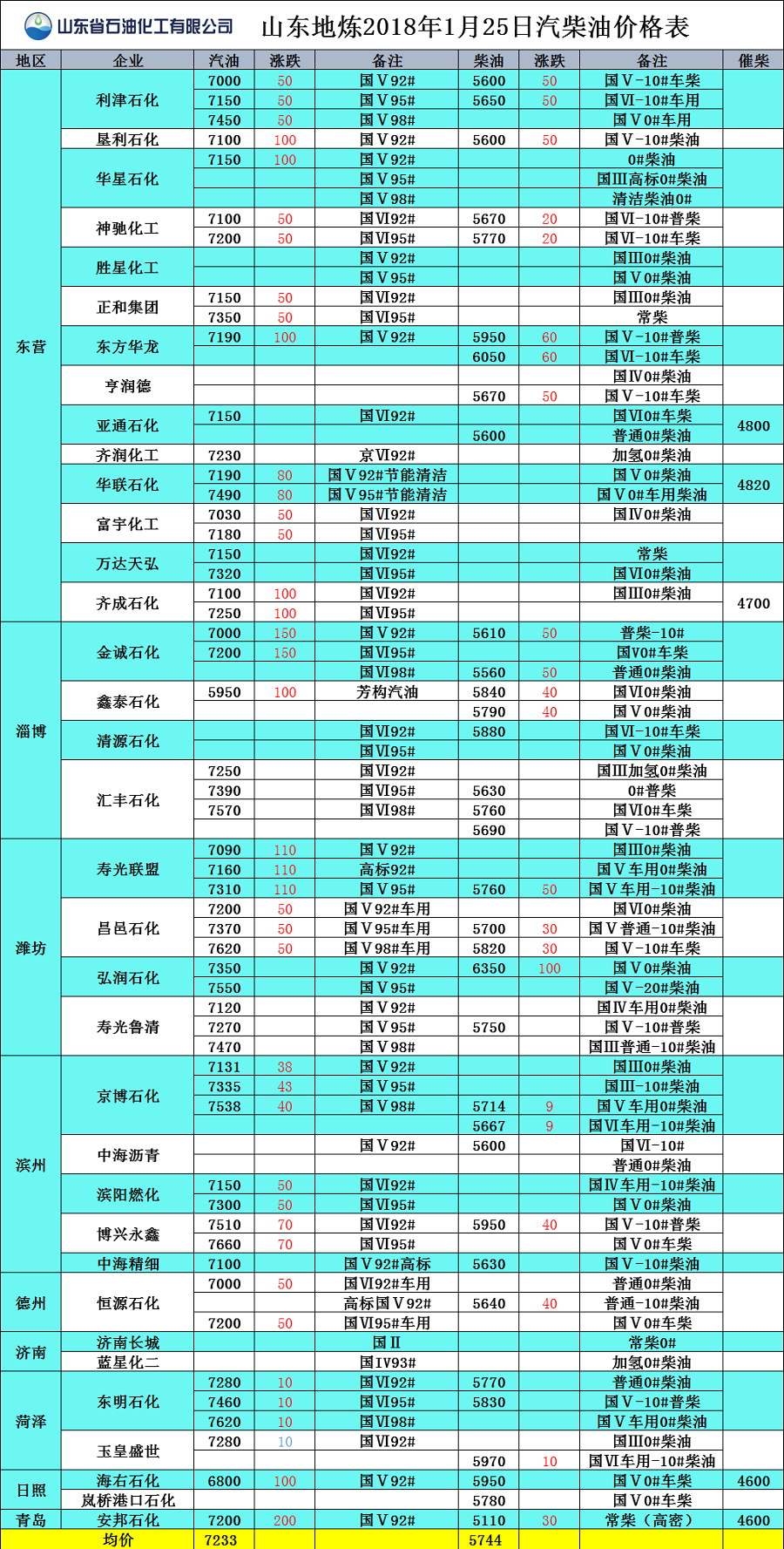 山東地煉2017年1月25日汽柴油價格表