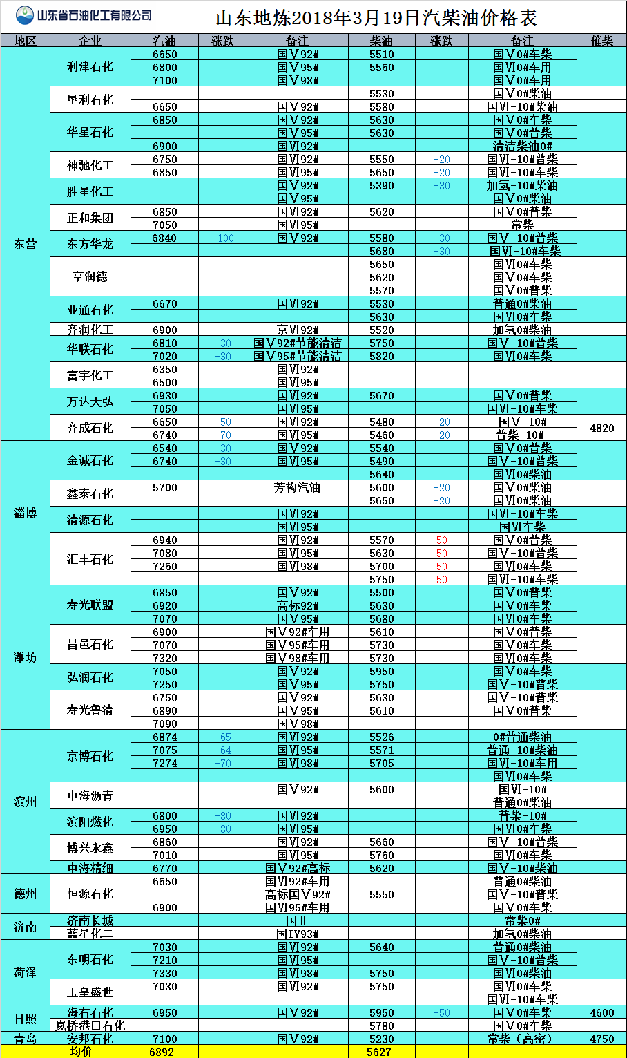 山東地煉2018年3月20日汽柴油價格表