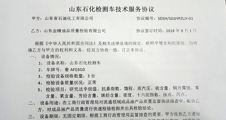8月1日,山東石化與濟(jì)寧金睛油品質(zhì)量檢測(cè)有限公司簽署技術(shù)服務(wù)協(xié)議,山東石化移動(dòng)油品檢測(cè)車從此開(kāi)始肩負(fù)起外部加油站油品檢測(cè)的重任。