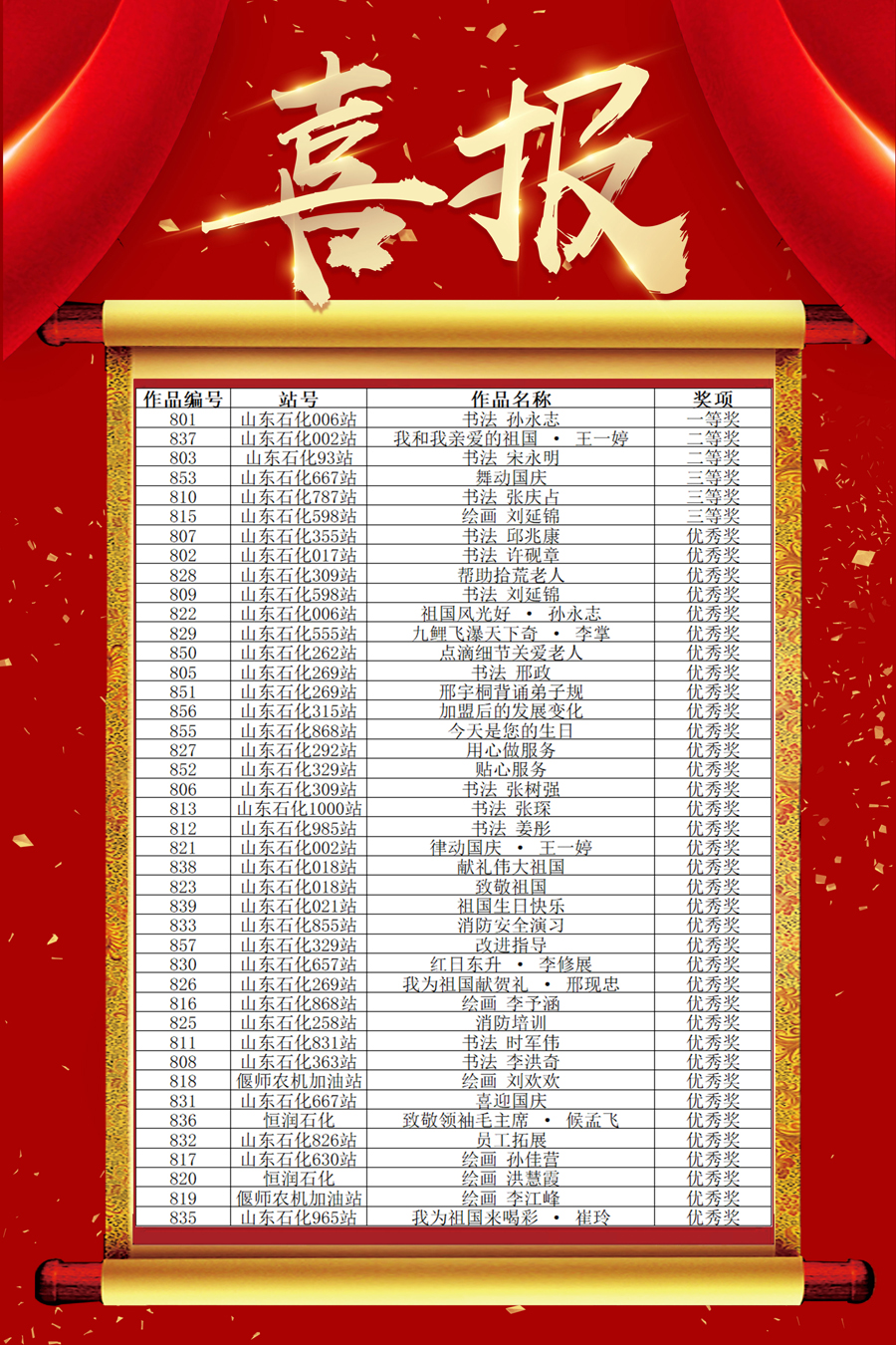 加油站作為山東石化優(yōu)秀企業(yè)文化的傳播窗口,能夠積極響應(yīng)并參與到此比賽中,體現(xiàn)了山東石化全體加油站和員工熱愛(ài)黨、熱愛(ài)祖國(guó)的愛(ài)國(guó)主義情懷和敬業(yè)奉獻(xiàn)、積極向上的精神風(fēng)貌。未來(lái),山東石化所有家人們將會(huì)繼續(xù)攜手共進(jìn),共鑄美好未來(lái)!
