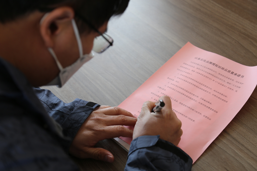 在本次“油品質(zhì)量萬里行”活動的啟動現(xiàn)場,數(shù)十位山東石化特許經(jīng)營站點負責(zé)人簽訂了“油品質(zhì)量承諾函”,負責(zé)人們紛紛承諾將堅決保證成品油質(zhì)量,全力確保油品質(zhì)量合格,堅守質(zhì)量誠信,規(guī)范經(jīng)營,保障消費安全,不斷提升油品質(zhì)量,切實維護消費者權(quán)益。