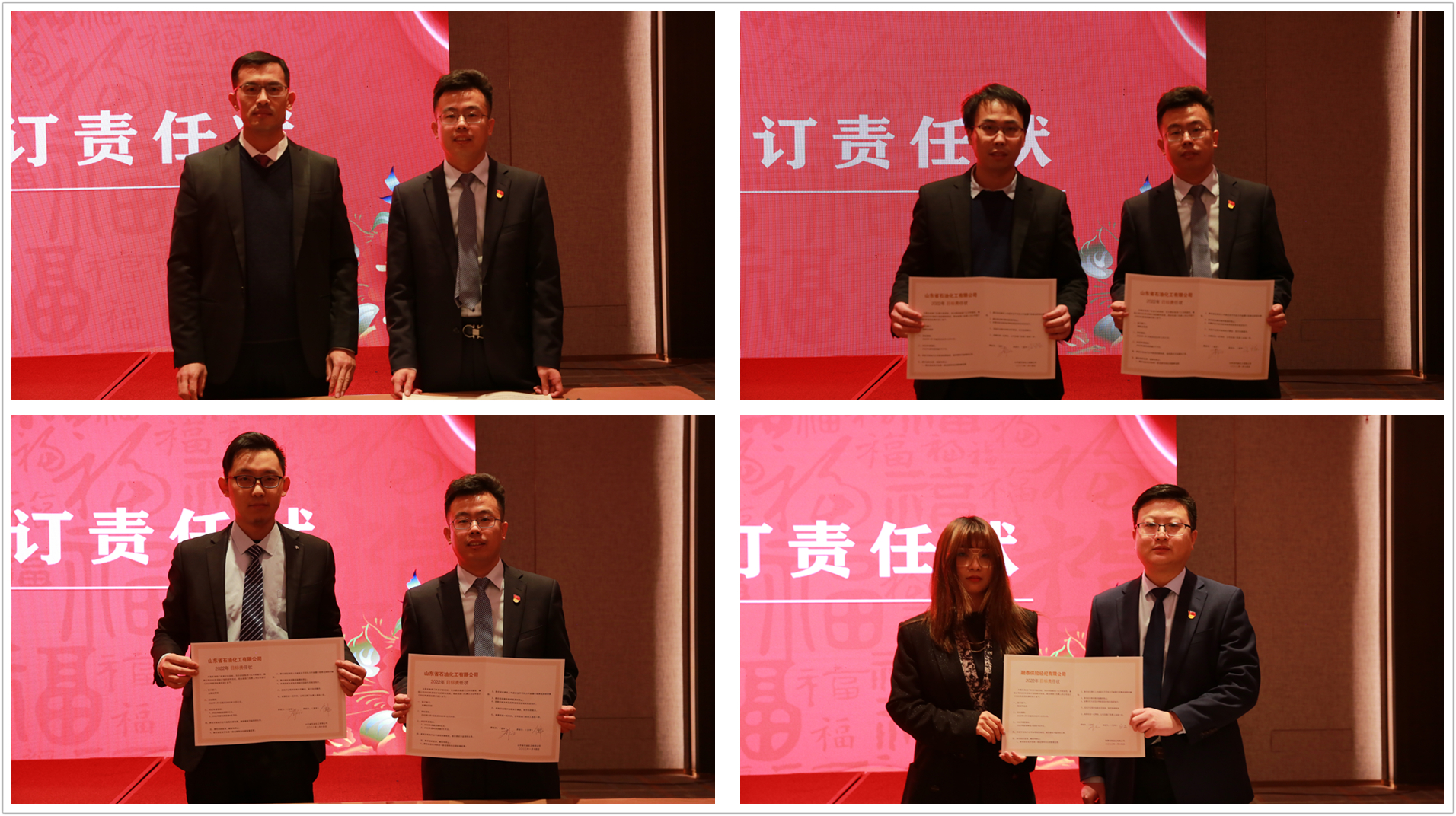 山東石化總經(jīng)理李作江、融泰保險經(jīng)紀總經(jīng)理劉龍,分別上臺與各業(yè)務(wù)部門簽署2022年目標責任書。