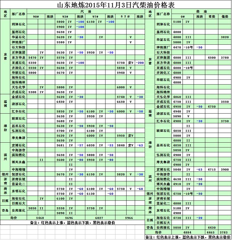 2015年11月3日山東地煉汽柴油價格表