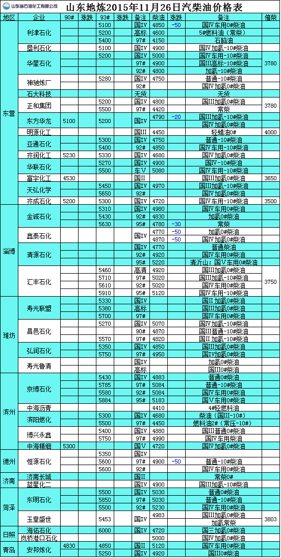 2015年11月26日山東地煉汽柴油價格表