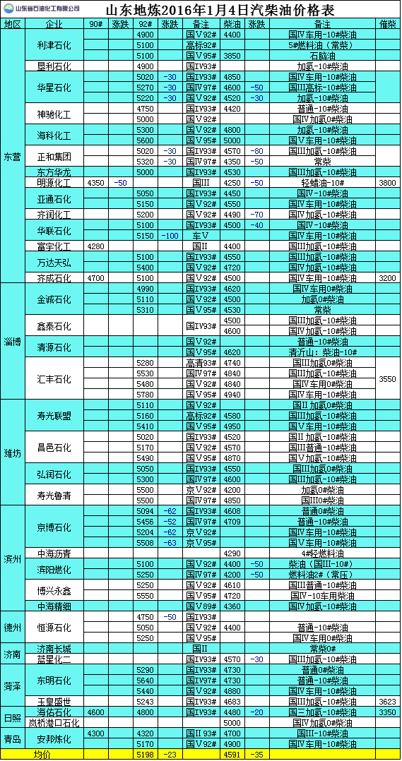 2016年1月4日山東地?zé)捚裼蛢r格表