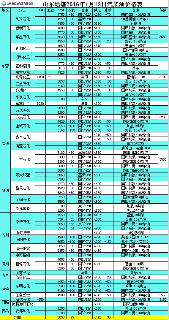 2016年1月12日山東地?zé)捚裼蛢r(jià)格表