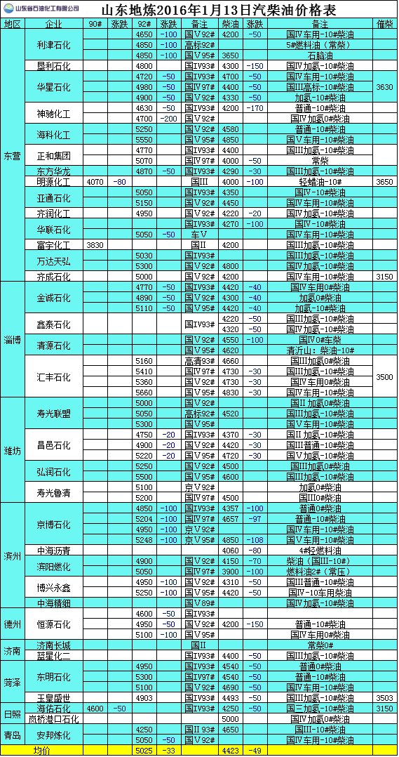 2016年1月13日山東地?zé)捚裼蛢r格表
