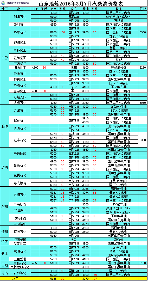 2016年3月7日山東地煉汽柴油價格表