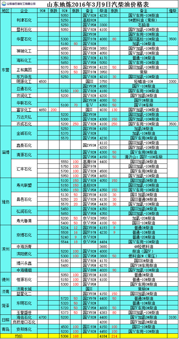 2016年3月9日山東地煉汽柴油價格表