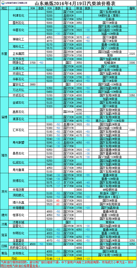 2016年4月19日山東地煉汽柴油價格表