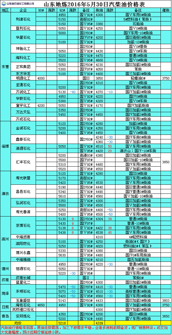 2016年5月30日山東地煉汽柴油價格表
