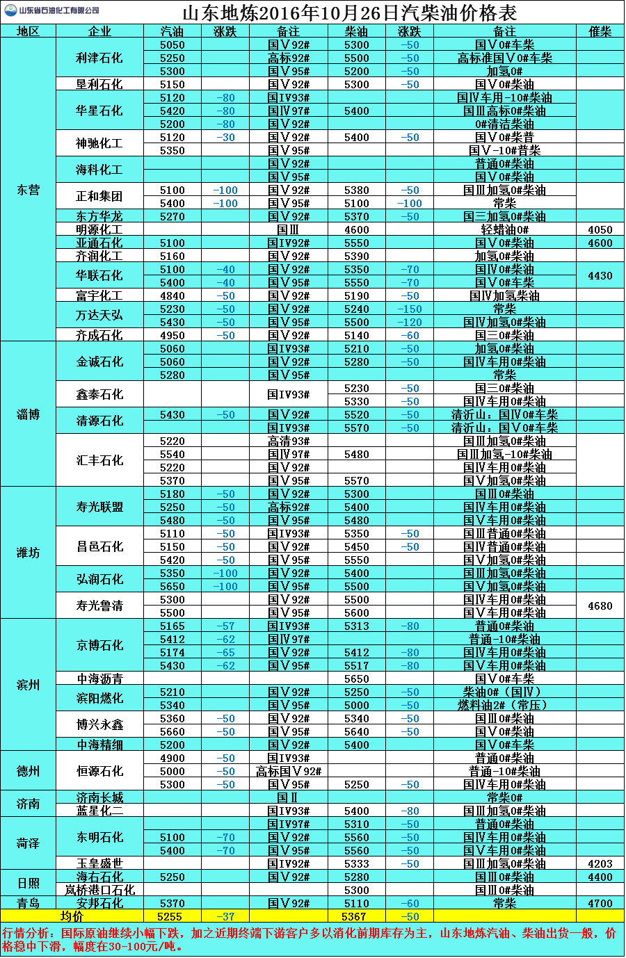 10月26日山東地煉汽柴油價格