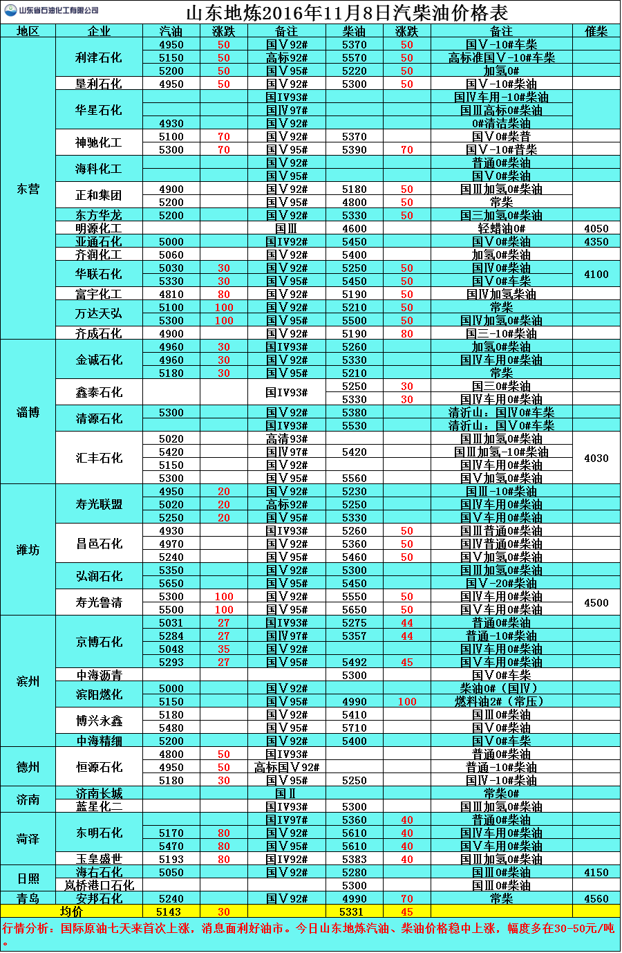 行情分析:國際原油七天來首次上漲,消息面利好油市。今日山東地?zé)捚?、柴油價格穩(wěn)中上漲,幅度多在30-50元/噸。