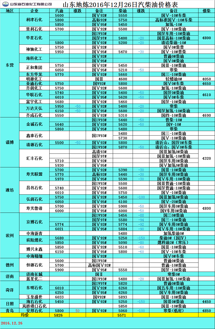12月26日山東地煉汽柴油價格