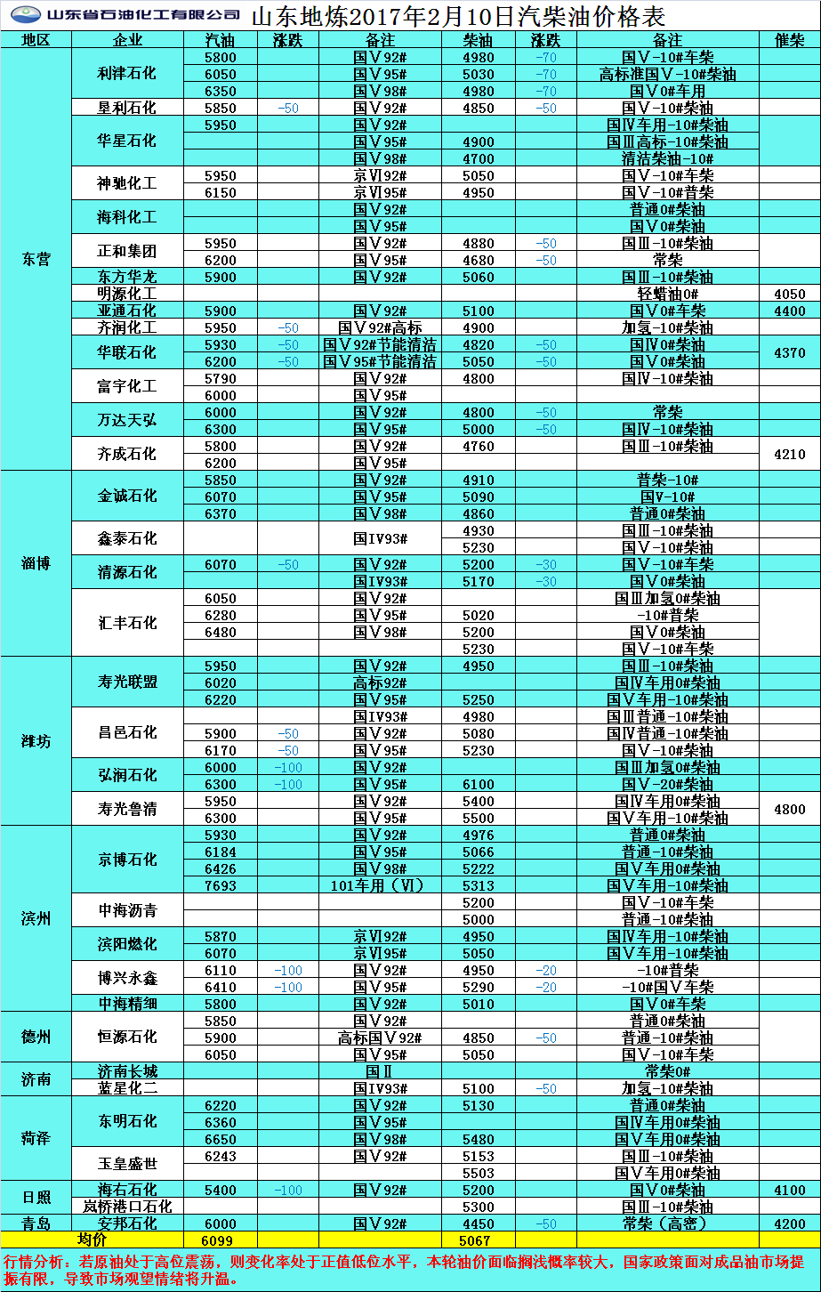 2017年2月10日山東地煉汽柴油價格