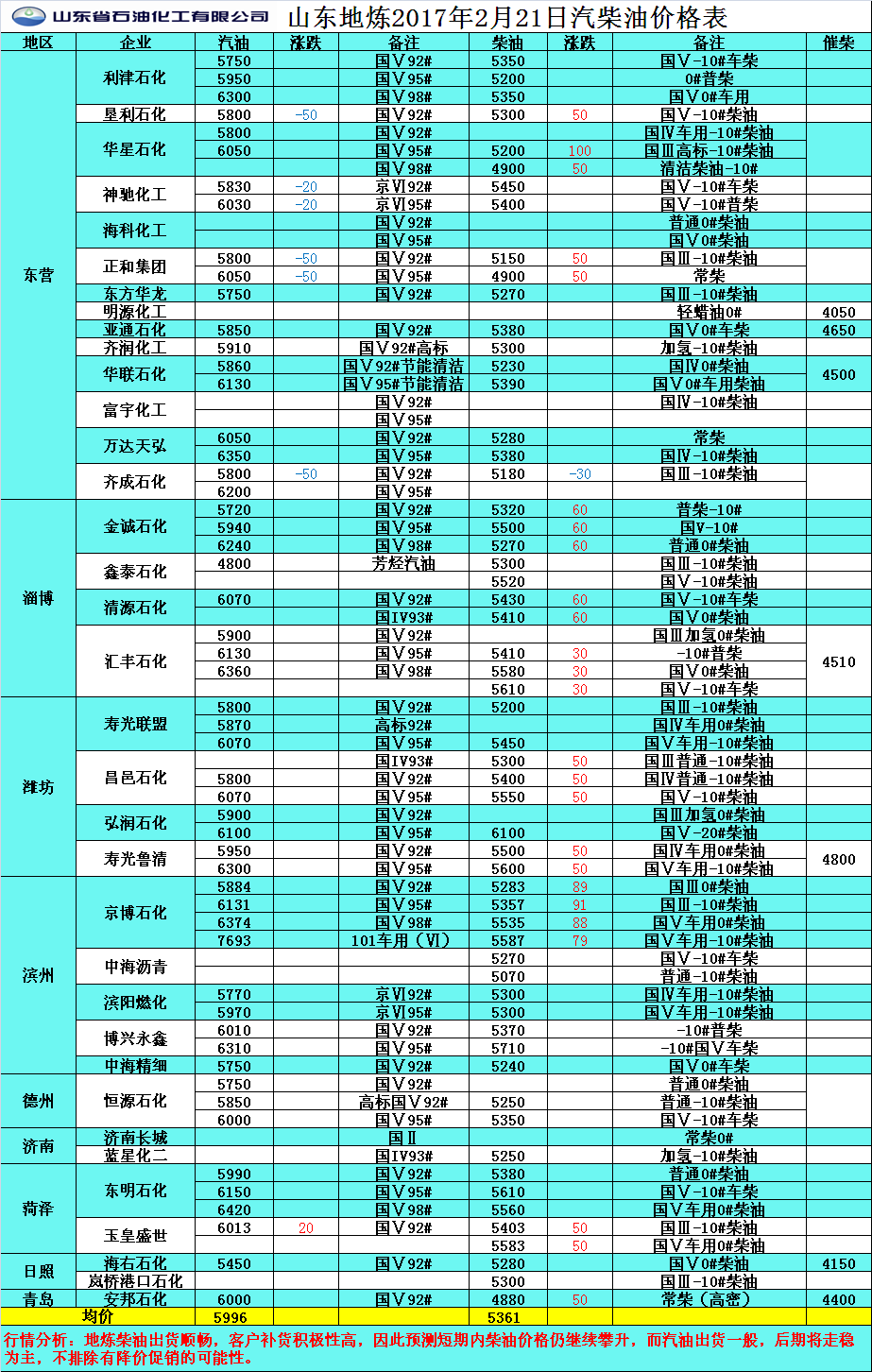 2017年2月22日山東地煉汽柴油價格
