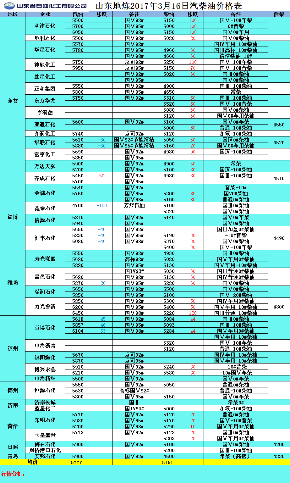 2017年3月17日山東地煉汽柴油價格