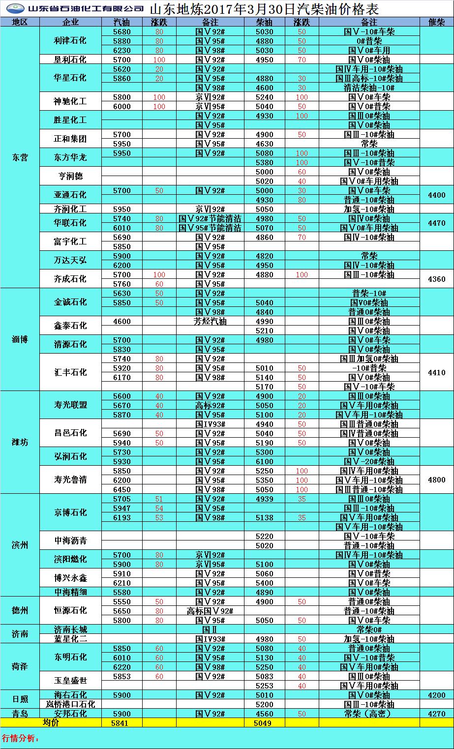 2017年3月31日山東地煉汽柴油價格