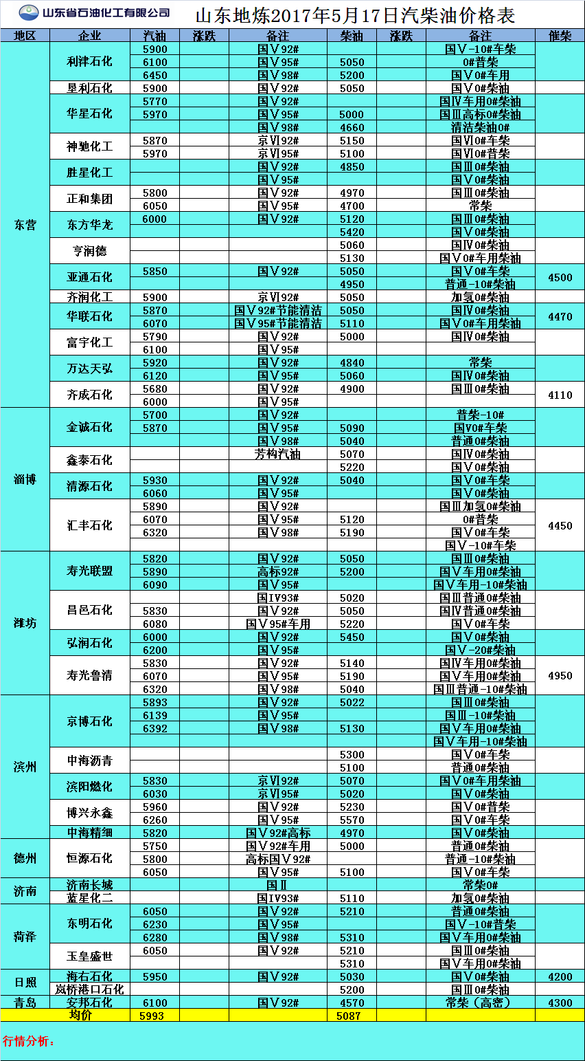 2017年5月17日山東地煉汽柴油價格