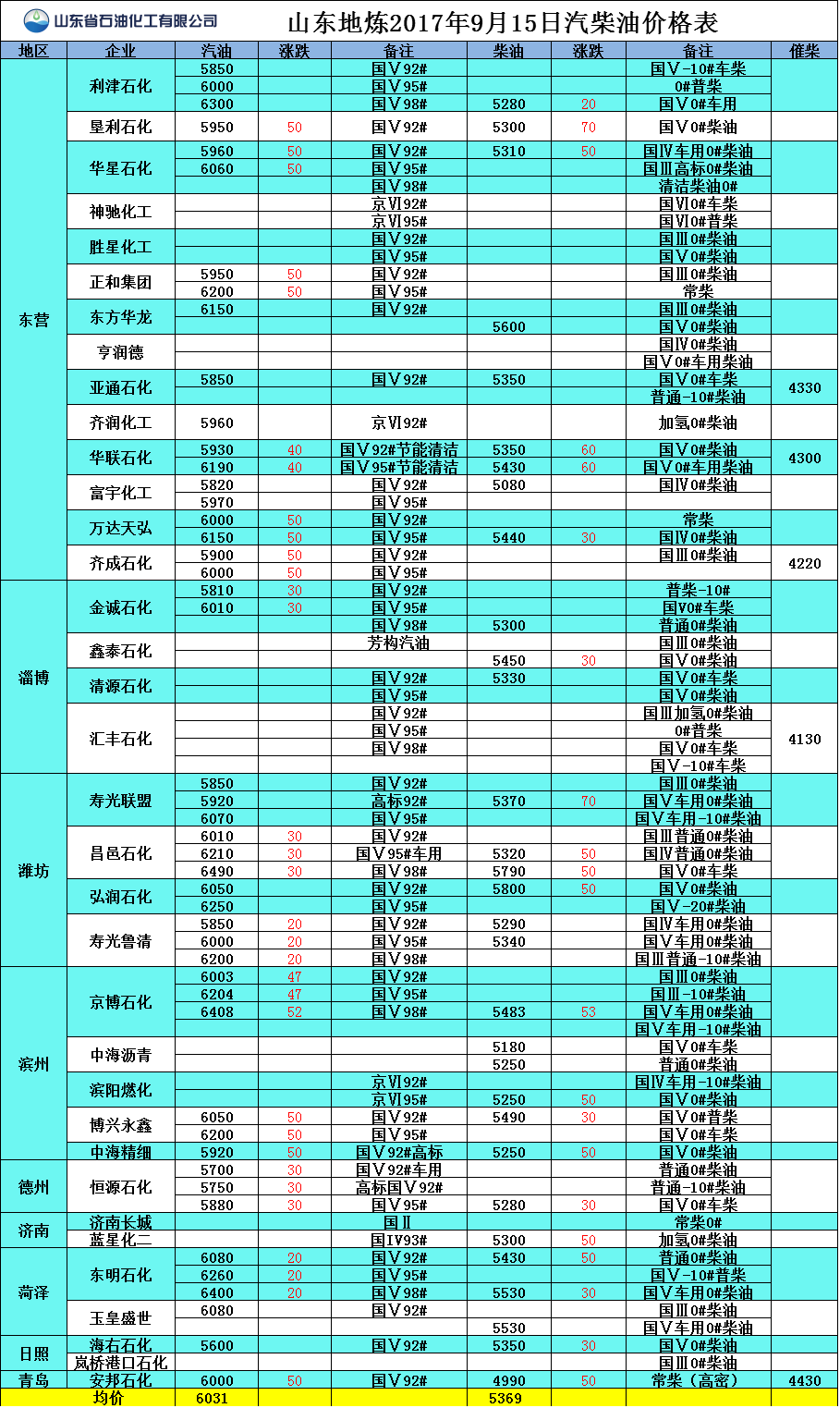 山東地?zé)?017年9月15日汽柴油價(jià)格表
