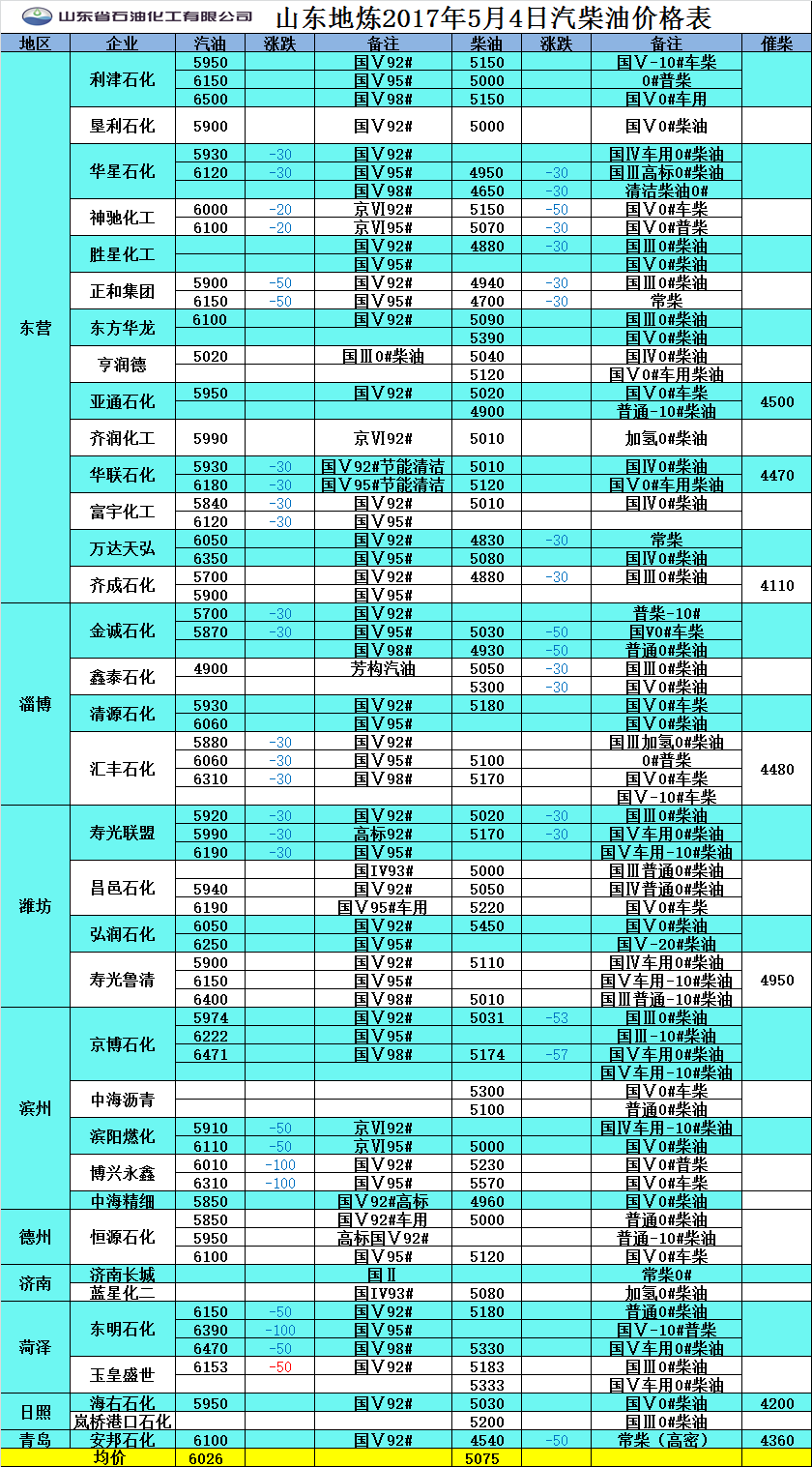 2017年5月4日山東地煉汽柴油價格